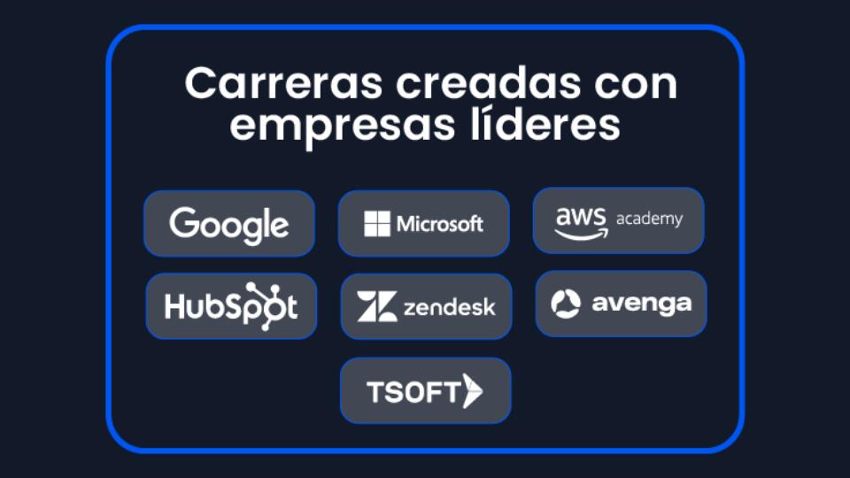 Teclab cuenta con una oferta académica de carreras creadas con referentes globales de la industria como Google, Microsoft, AWS, HubSpot, entre otras.