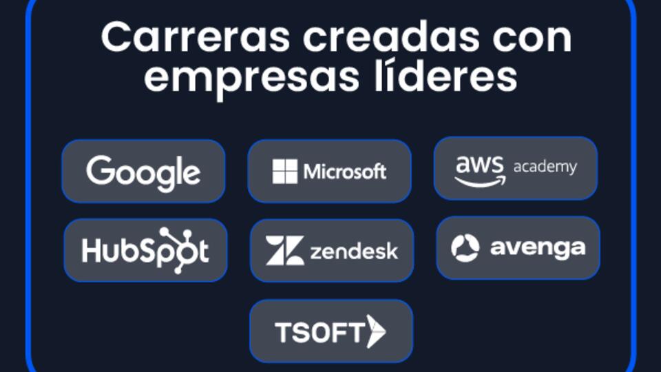 - Carreras diseñadas junto a empresas líderes como Google, Microsoft, Hubspot y AWS.